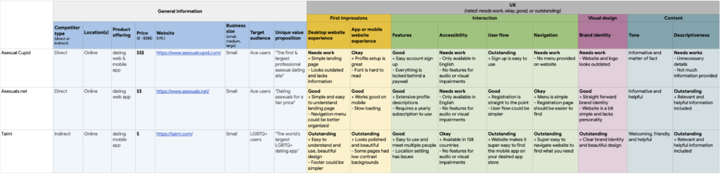Competitive audit spreadsheet of two direct competitors, Asexual Cupid and Asexuals.net, and an indirect competitor, Taimi.