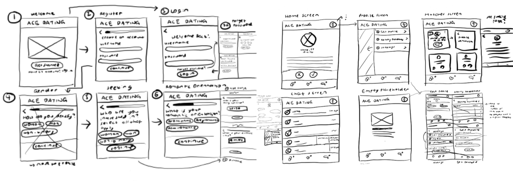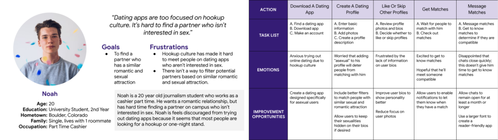 Using this persona, I constructed a user journey map to better understand the experiences of an asexual person navigating a traditional dating app. This helped me brainstorm opportunities and improvements my dating app could address, and focus on the most important design decisions.
