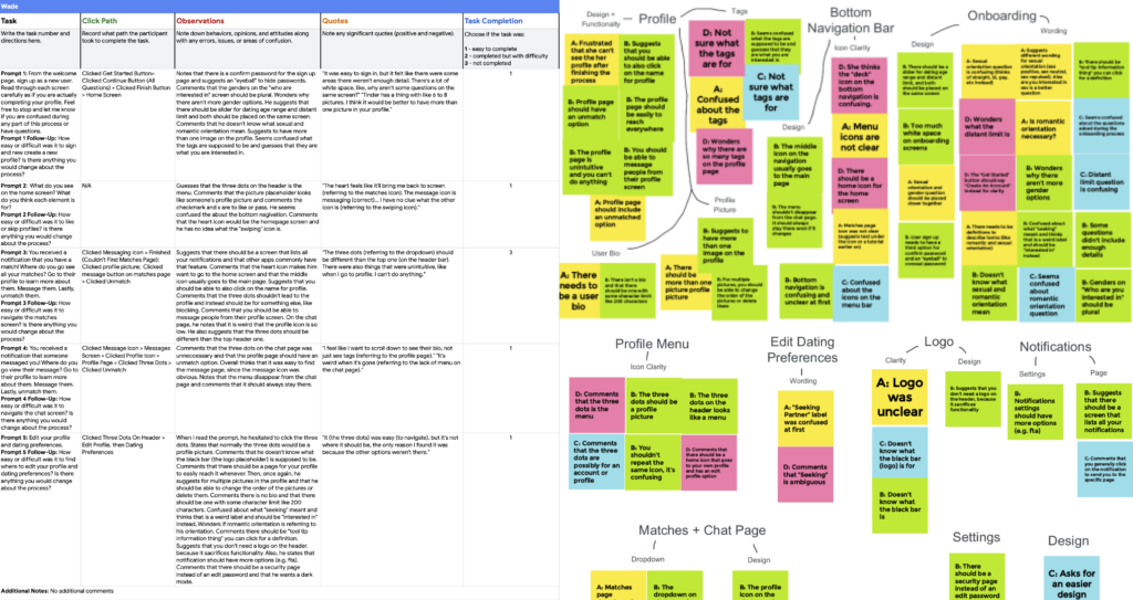 Spreadsheet of usability study notes (left). Affinity diagram (right).