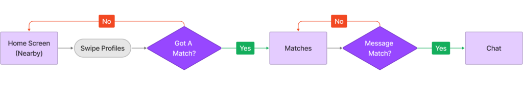 User flow outlining how a user might interact with a dating app, from swiping to chatting with a match.