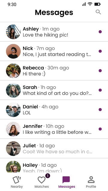 After the first usability study, I added an “Unmatch” button to the profile card, and “Unmatch” and “Message” buttons to the profile page for increased functionality. I also added a notification icon to indicate new matches.