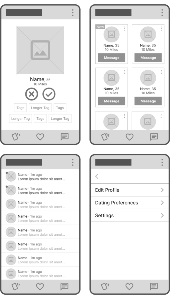 The profile menu allows users to easily view and edit their profile, dating filters, or settings. In the digital wireframes, the profile menu was originally placed in the top navigation bar, right of the logo.