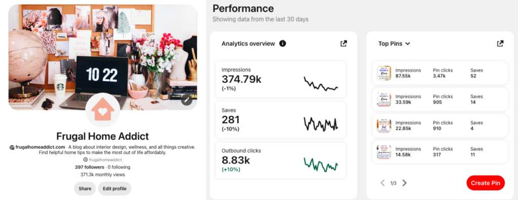 I also became interested in social media and decided to create a Pinterest account to drive social traffic to the website. Since Frugal Home Addict contains long-form content on home decor, I determined that Pinterest would be the most appropriate platform.