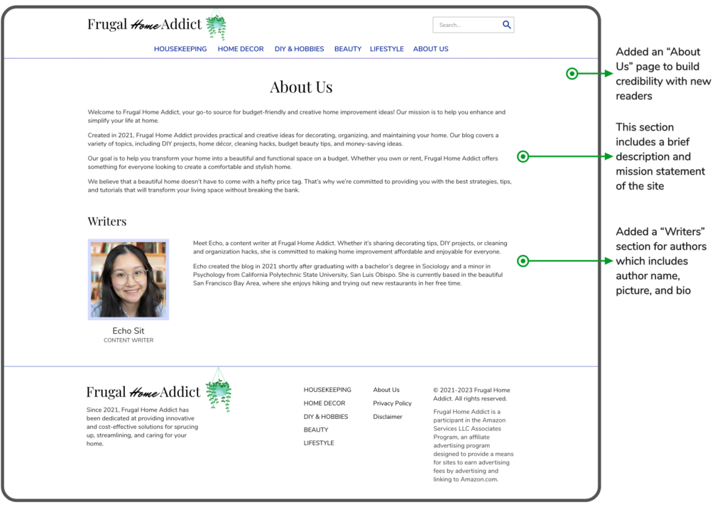 Following the competitive analysis, I added an about page to build credibility with readers by outlining the brand’s history and mission. This page also features a section dedicated to the writers, showcasing their backgrounds, experience, and expertise.