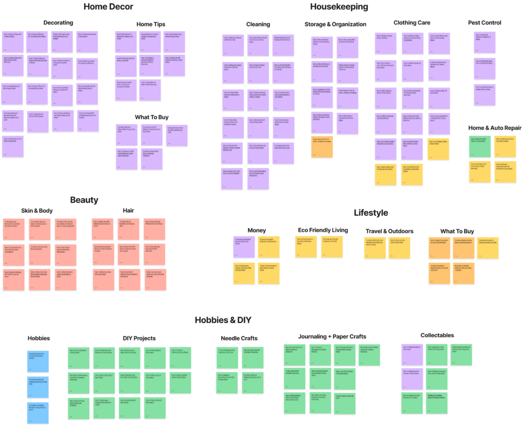 Using an affinity diagram, I grouped posts and created new categories and subcategories based on common themes. Insights from the competitive analysis also helped inspire new category ideas.