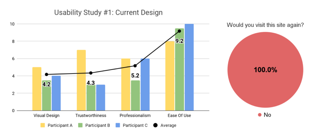 Although the site’s ease of use received an impressive average rating of 9.2, the visual design, trustworthiness, and professionalism scored lower at 4.2, 4.3, and 5.2 respectively. Unfortunately, none of the participants expressed a desire to revisit the site.