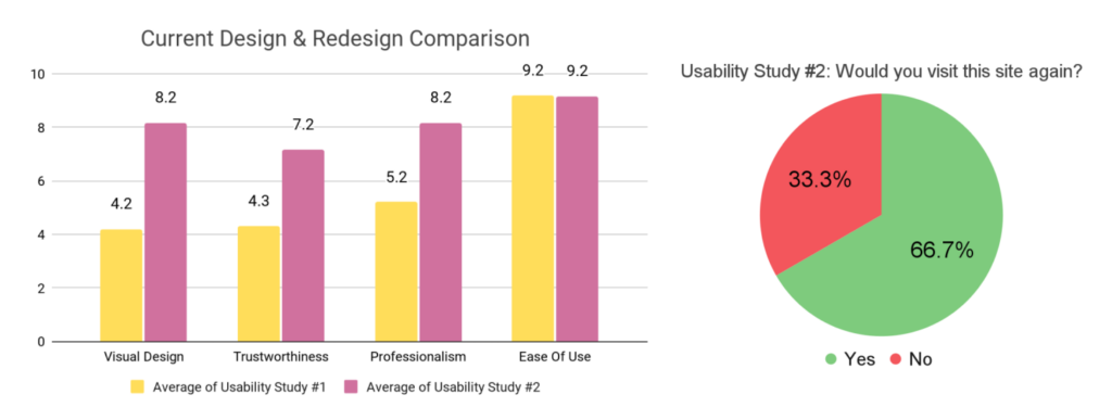 The second usability study confirmed the redesign was a success. Visual design saw a remarkable improvement of 94%, while trustworthiness and professionalism increased by 67% and 57%, respectively. Additionally, the website redesign resulted in a significant increase in revisit interest, from 0% to 66.7%. Participants also gave less feedback, indicating a more efficient and enjoyable experience.