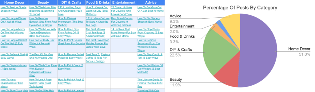 Upon my analysis, I found that the Home Decor category constitutes 51% of all the posts. To improve content distribution, I will need to update the current categories by with more specific categories and subcategories.