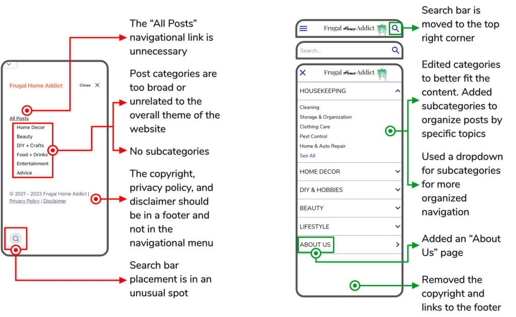 The first usability study revealed that the original categories are too broad or unrelated. As a result, I edited the categories to better fit the content and added subcategories to organize posts by specific topics. For cleaner navigation, I used a dropdown menu to display subcategories under the main categories.