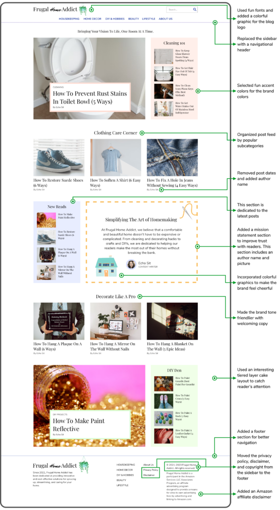 Frugalhomeaddict.com was redesigned to improve its visual design, trustworthiness, and professionalism, after receiving poor rankings in the initial usability study.
