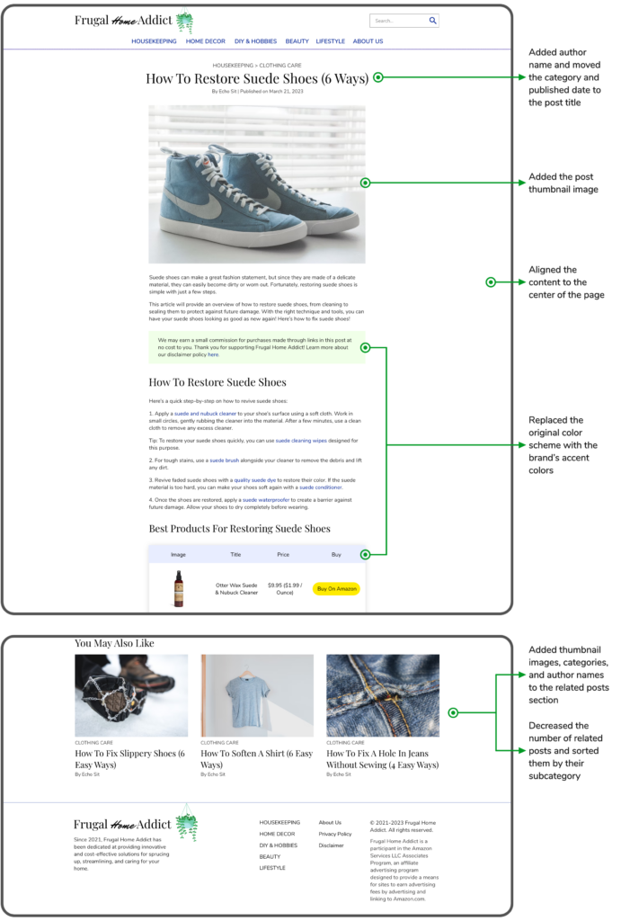The blog post design underwent minor modifications. To enhance trust and improve navigation, I placed the author name, category, and publication date next to the post title. Other design changes include adding a thumbnail image, centering the content, and replacing the original color scheme with the brand’s accent colors.