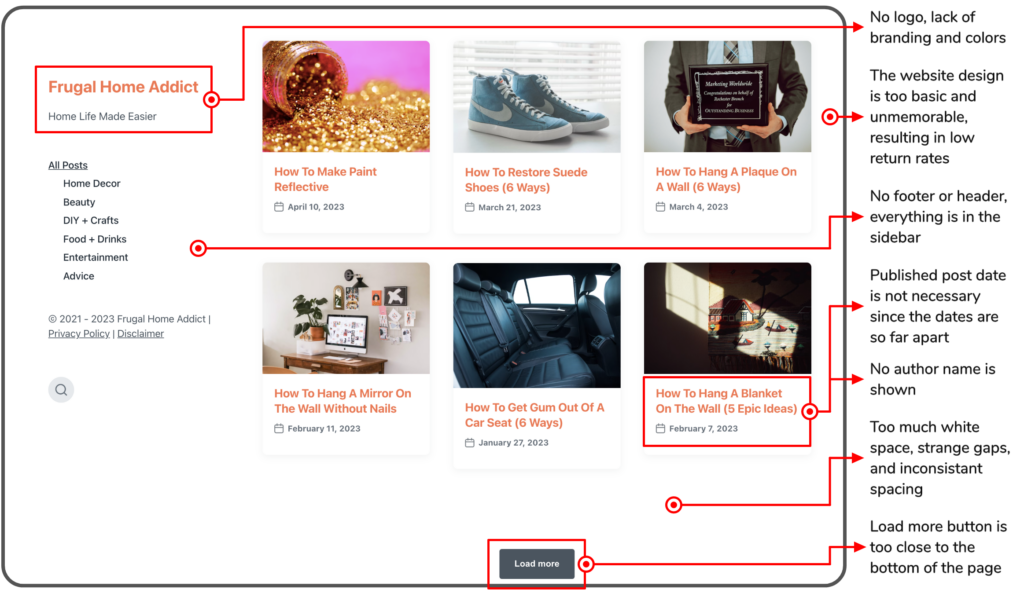Frugal Home Addict uses a simple WordPress theme, lacks brand identity, and has disorganized categories. This case study aims to address these issues by improving its visual design and site map.