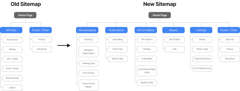 Using the updated categories from the content audit, I redesigned the site map for better navigation.