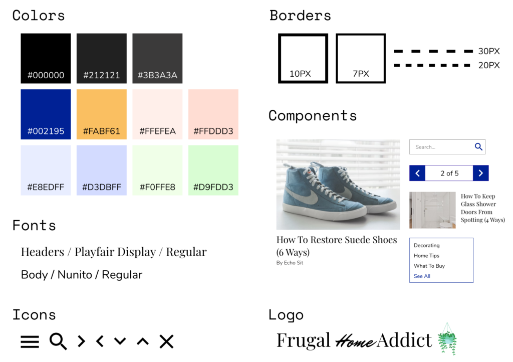 I developed a style guide to ensure consistent branding and design across Frugal Home Addict’s digital platforms. This included using lively accent colors and playful fonts to create a cheerful atmosphere.